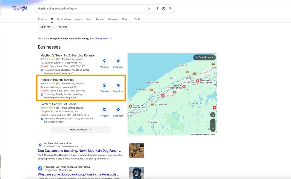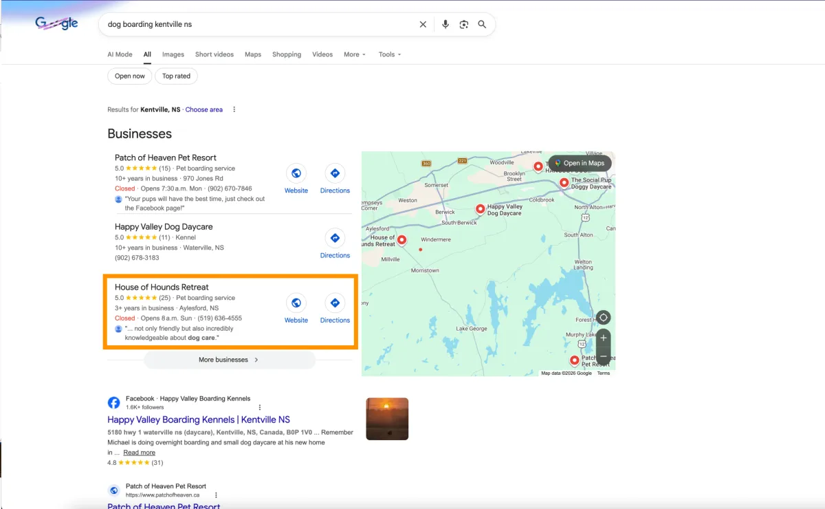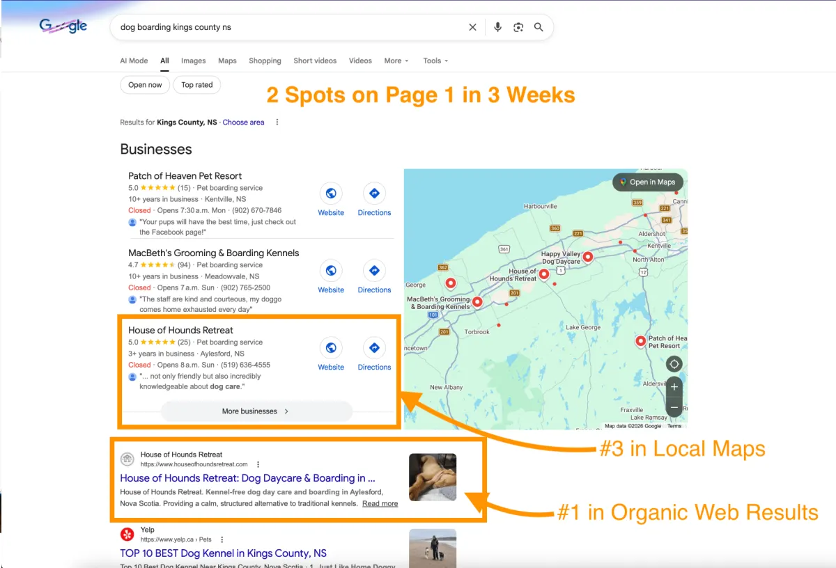 How we helped this small dog boarding & day care business go from not being found on Google to Page 1 in less than 30 days.